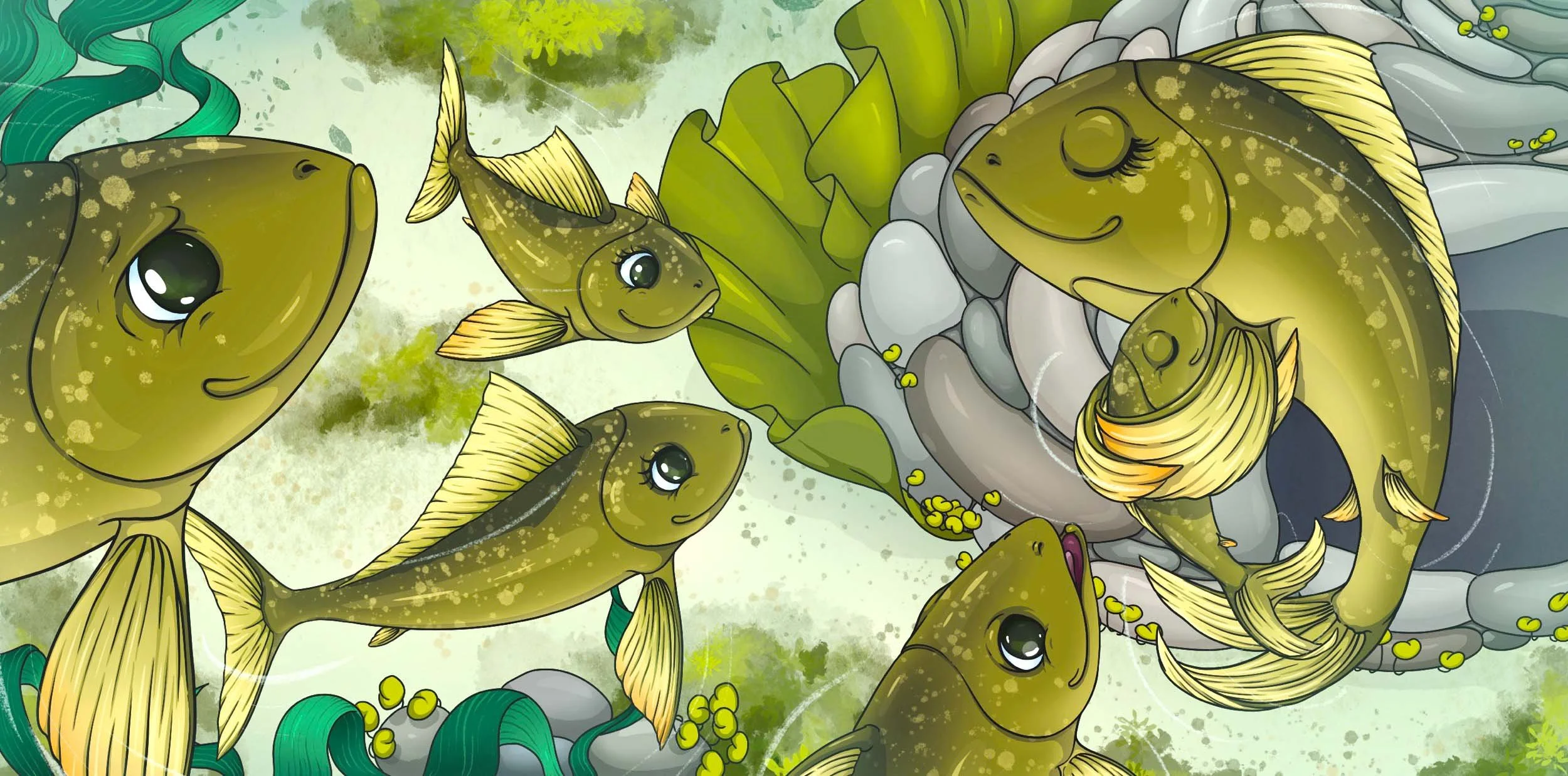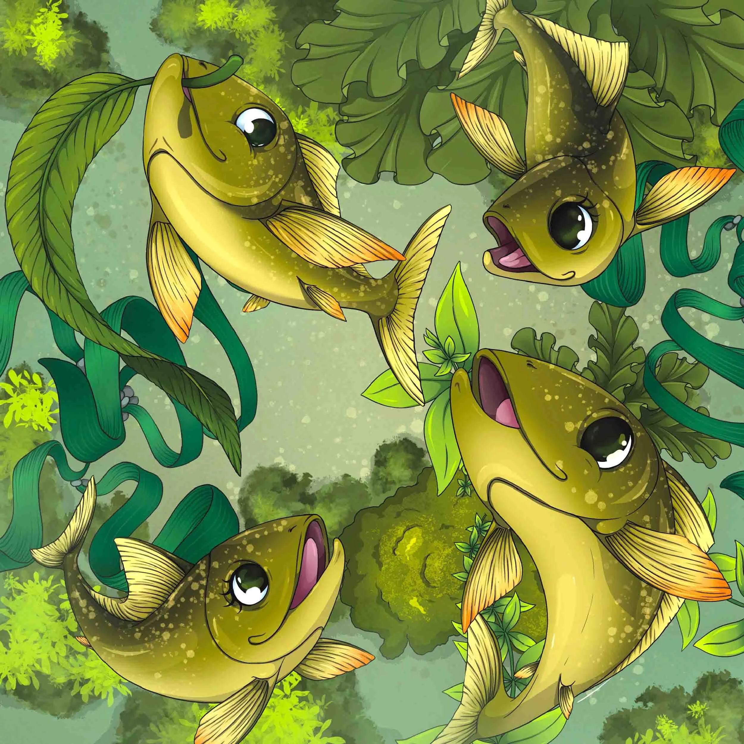 The color palette was chosen to immerse the reader in the underwater world of the pond. Details like plants, stones, and bubbles in the background create a realistic yet subtle atmosphere that doesn’t distract from the main characters. All elements of the illustrations work together to emphasize the core message of