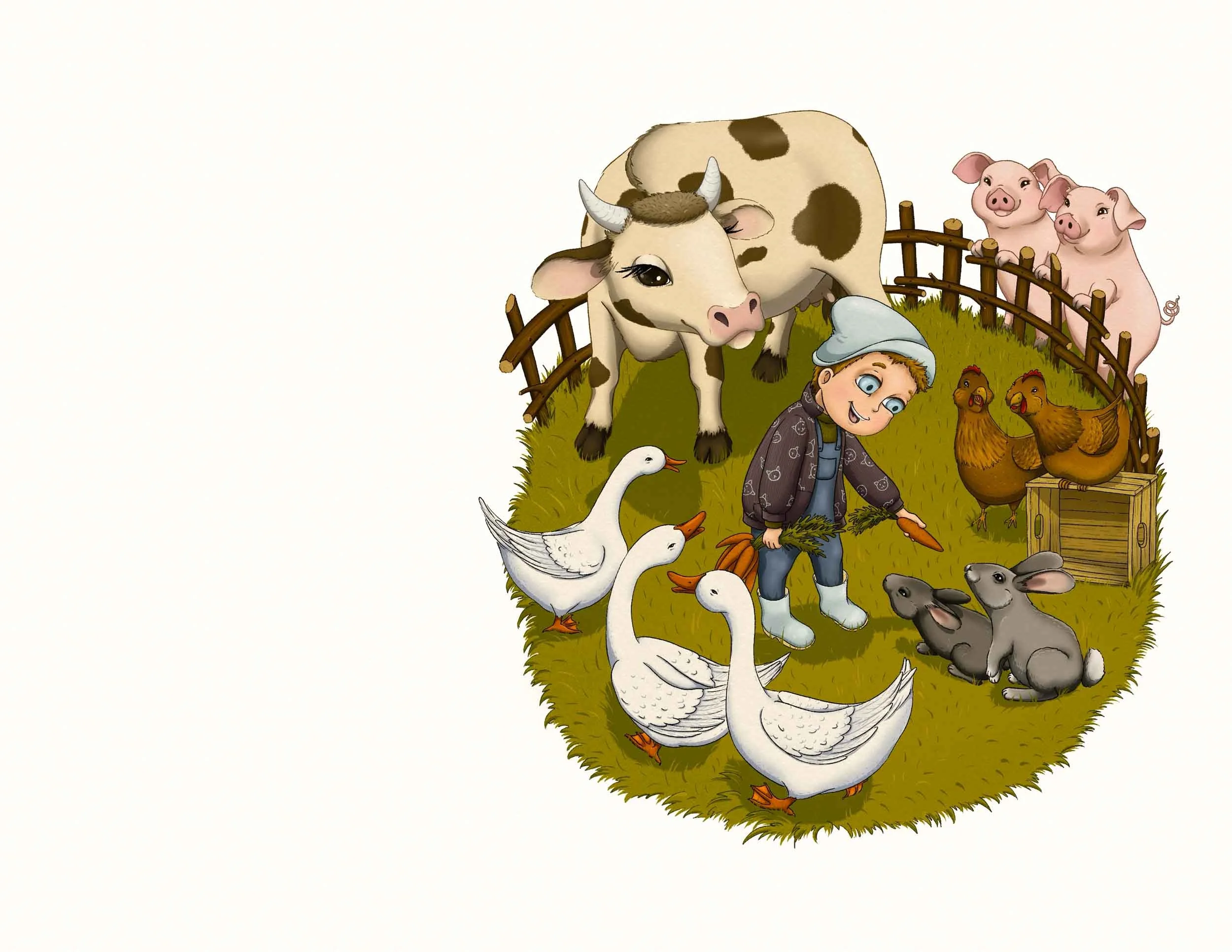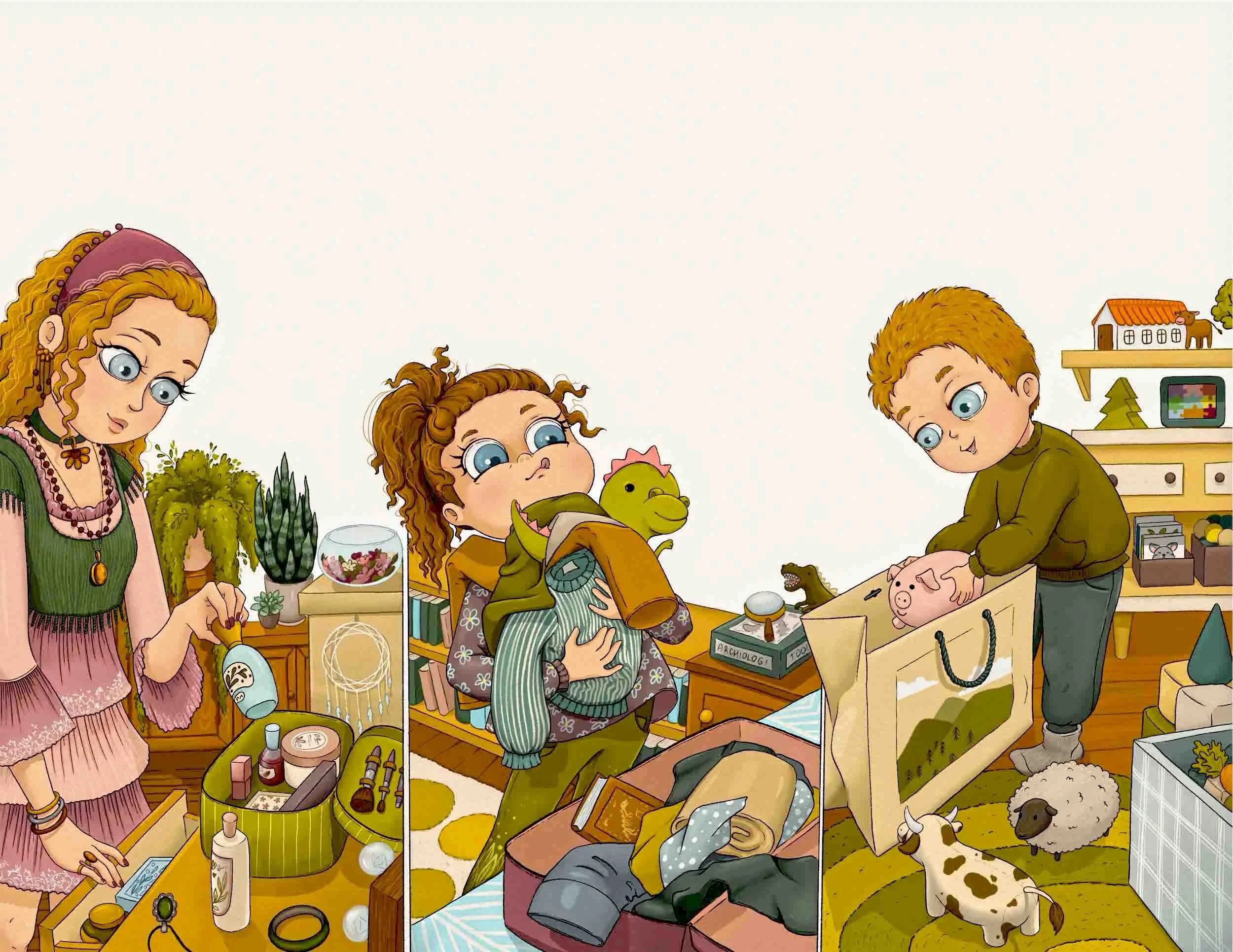 I picked a warm color palette with soft greens, browns, and pastels to bring a sense of peace and tenderness to the pictures. These colors capture the charm of village life, and each illustration highlights the moments that stay in your heart, even when you’re all grown up.